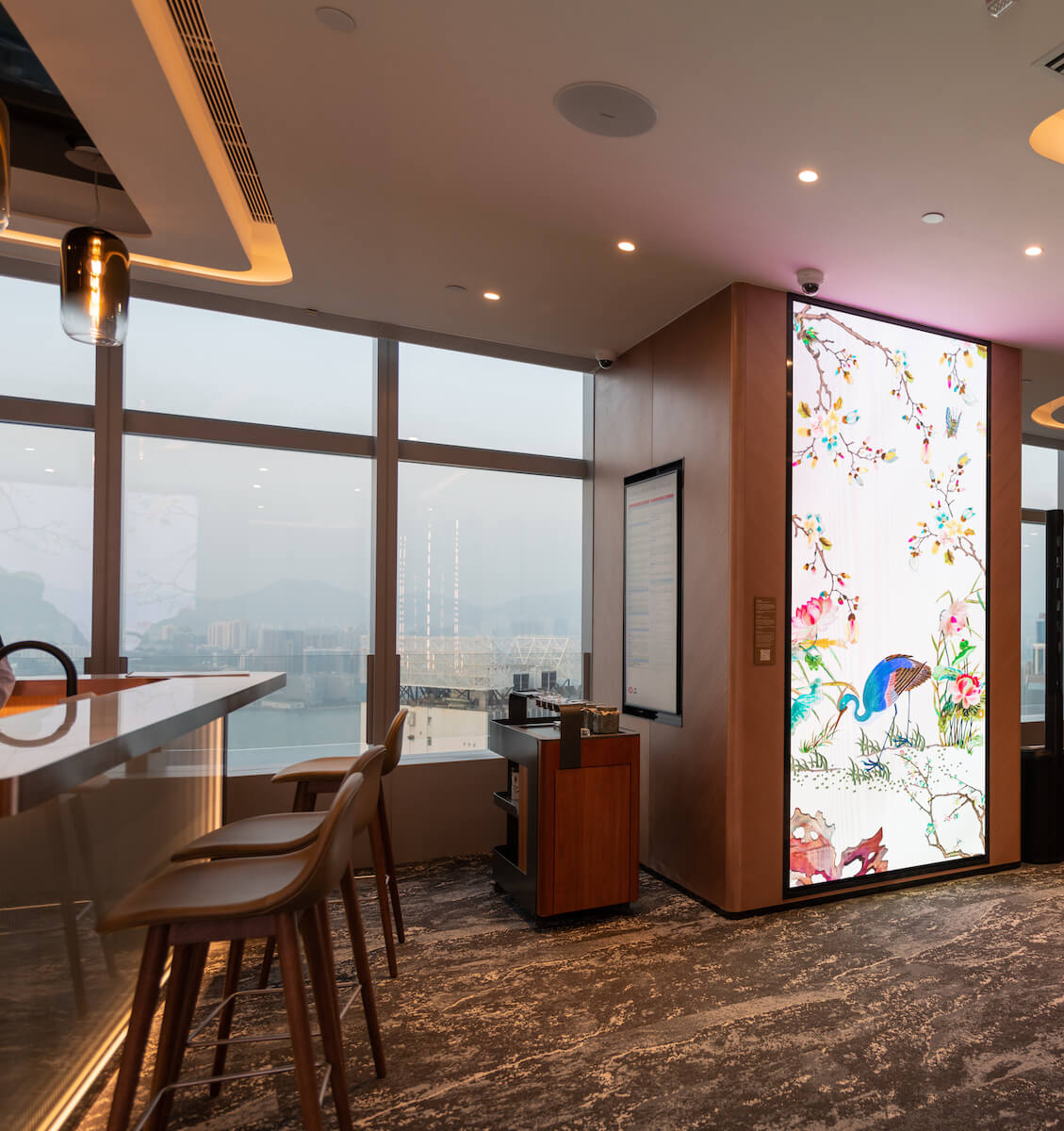 A major feature of the space is a unique digital experience entitled ‘Threads of Life’ evocatively embodying the values of HSBC’s Wealth Centre’s service inspired by the magnificent silk tapestry held by the HSBC Archives presented to Sir Thomas Jackson by Chinese merchants in 1902. The digital animation fully utilises the two screens within the Hysan Place Wealth Centre, sometimes in concert, sometimes independently. Another part of this experience is the Heritage Corridor, almost like a mini museum, that exhibits a collection of old banknotes, photos and documents of great historic value, a testament to the long history of HSBC in Hong Kong.